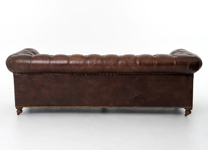 Inspired by the luxurious charm of 19th-century British gentlemen's clubs and libraries, this Chesterfield-style leather sofa features a classic design with button-tufting across the back, arms, and seat, complemented by elegant nail head accents. The legs are equipped with optional rollers, which can be removed if desired.
