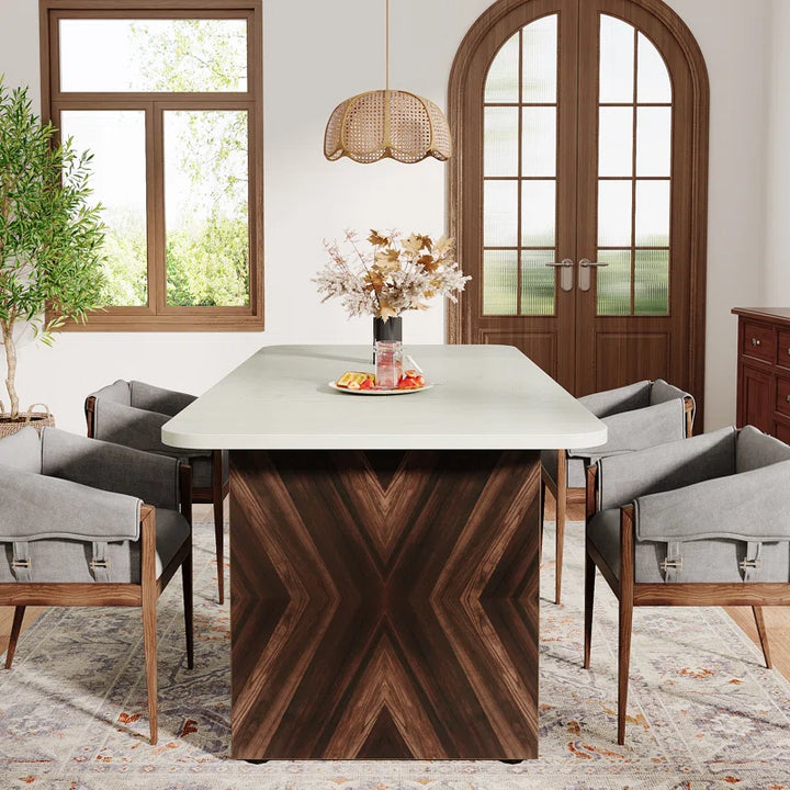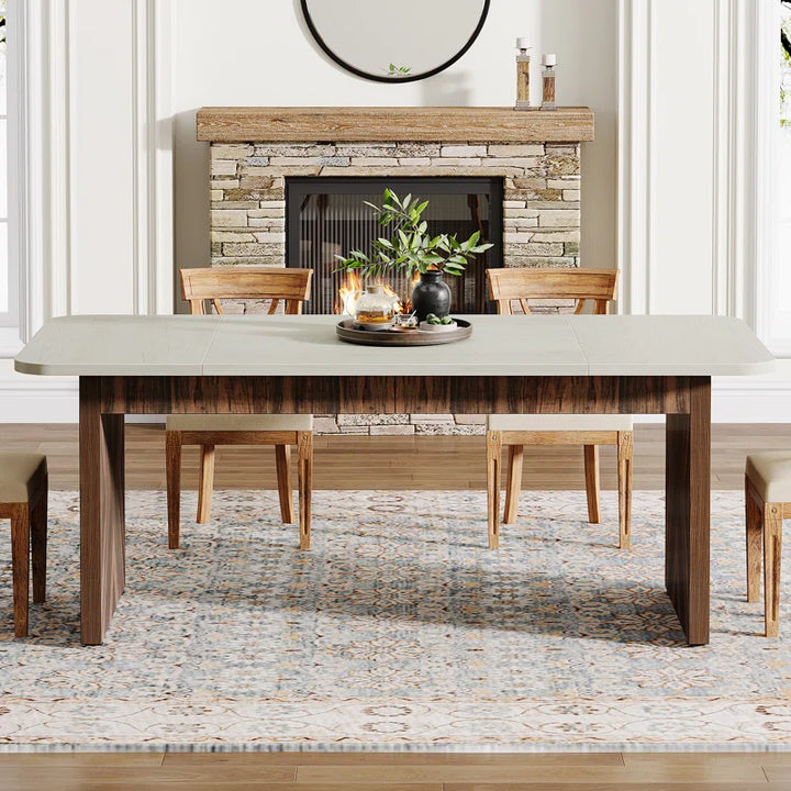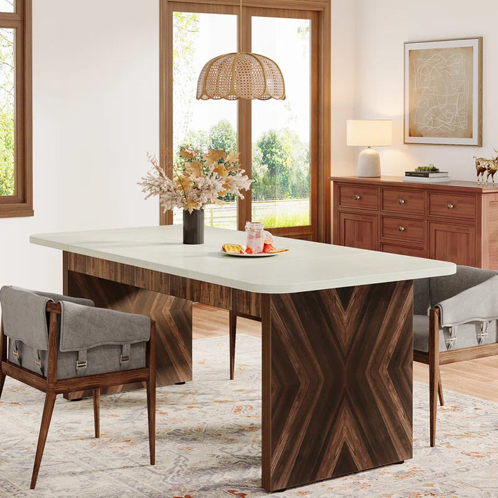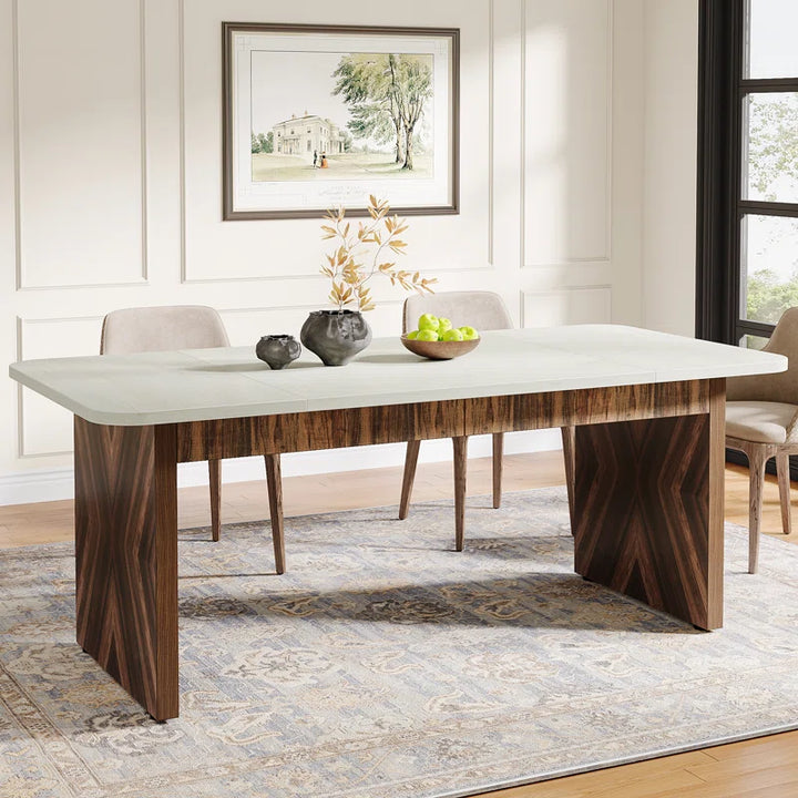Add an air of modern sophistication to your dining room with this Contemporary Two-Toned Manufactured Wood Dining Table. With generous dimensions of 70.86" W x 30.8" D x 29" H, this table serves as both a functional dining space and a striking focal point. The design features a light, smooth tabletop paired with dark wood legs that showcase a natural wood grain, creating a bold two-tone contrast. Crafted from high-quality manufactured wood, this dining table brings together durability and elegance, making it an ideal choice for family meals, entertaining, or as a workspace in your home or office.